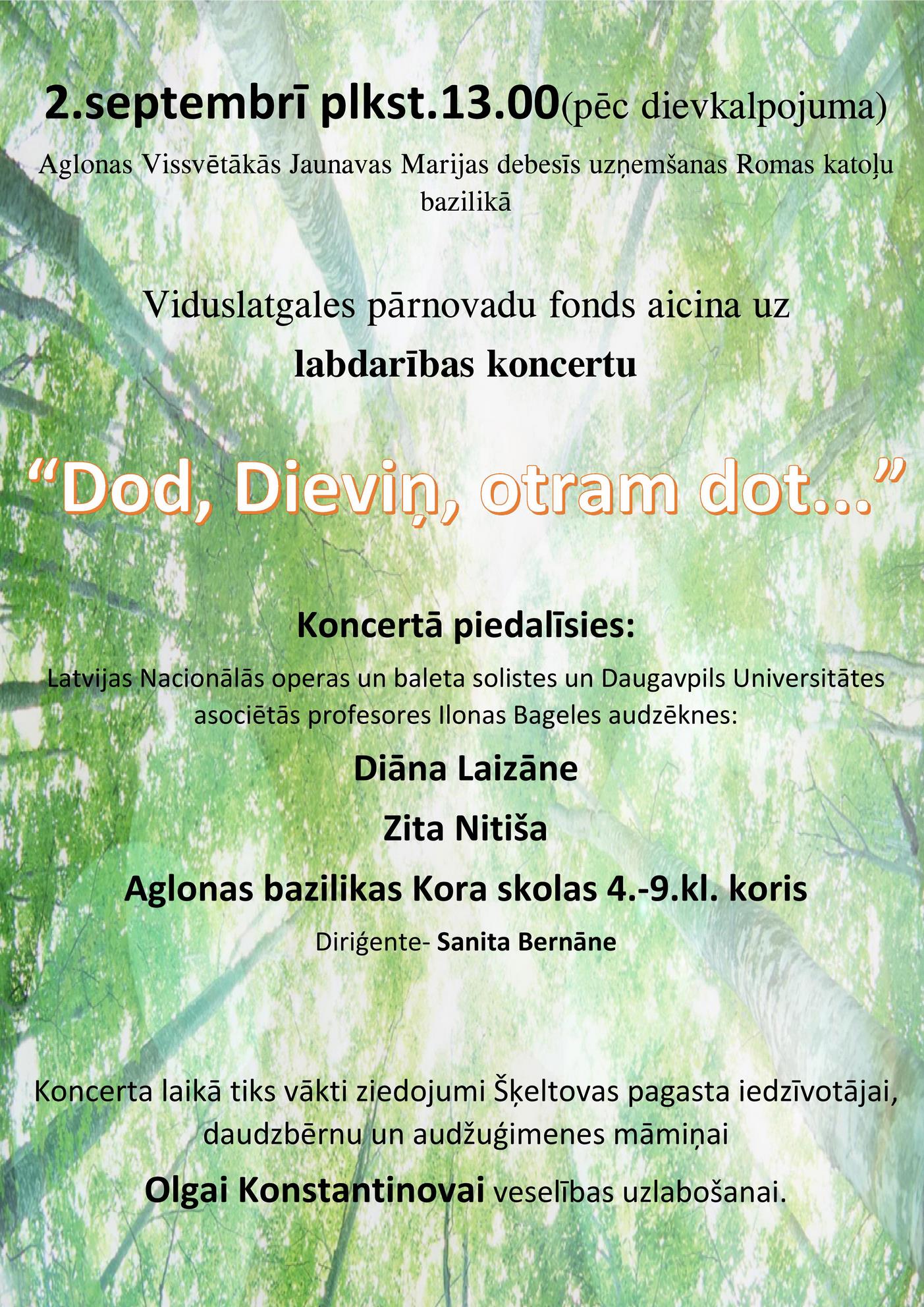 Aicinām uz labdarības koncertu "Dod Dieviņi otram dot..." 2. septembrī Aglonas Vissvētākās Jaunavas Marijas debesīs uzņemšanas Romas katoļu bazilikā
