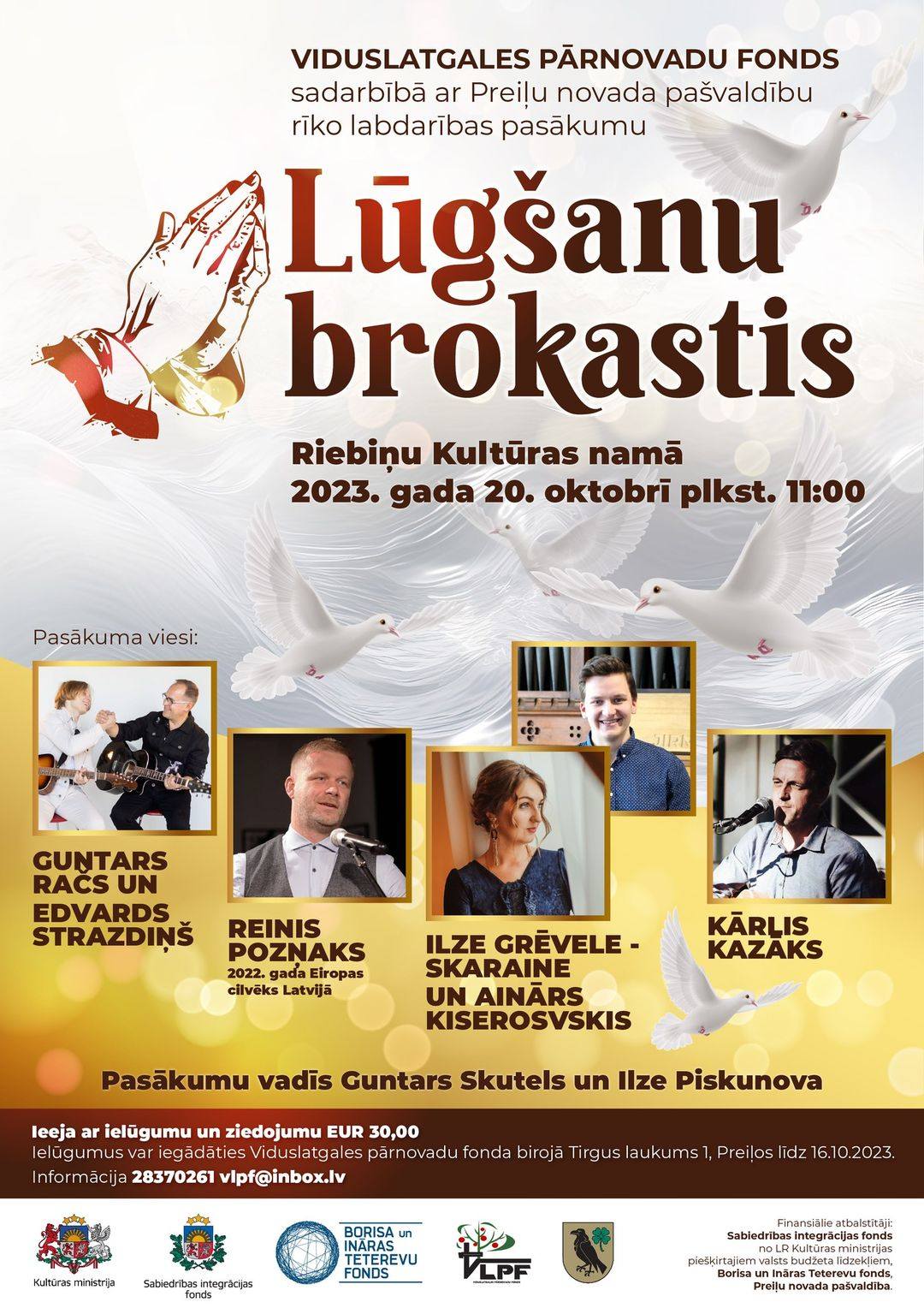 Ieeja pasākumā ar ielūgumu un ziedojumu 30,00 eiro. Ielūgumus var iegādāties Viduslatgales pārnovadu fonda birojā Tirgus laukums 1, Preiļos.