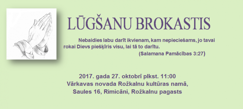 "Viduslatgales pārnovadu fonds” sadarbībā ar novadu pašvaldībām jau ceturto gadu pēc kārtas rīko Lūgšanu brokastis, šogad 27. oktobrī, Vārkavas novadā. Šī gada tēma ir : tuvāk mīlestība, labestība…