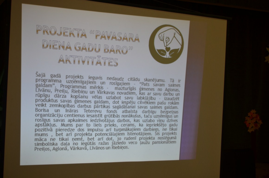 6. oktobrī Vārkavas tautas namā notika apjomīgā Borisa un Ināras Teterevu fonda labdarības projekta „Pats savam saimes galdam” Viduslatgales pārnovadu fonda projekta „Pavasara diena gadu baro” noslēguma pasākums.