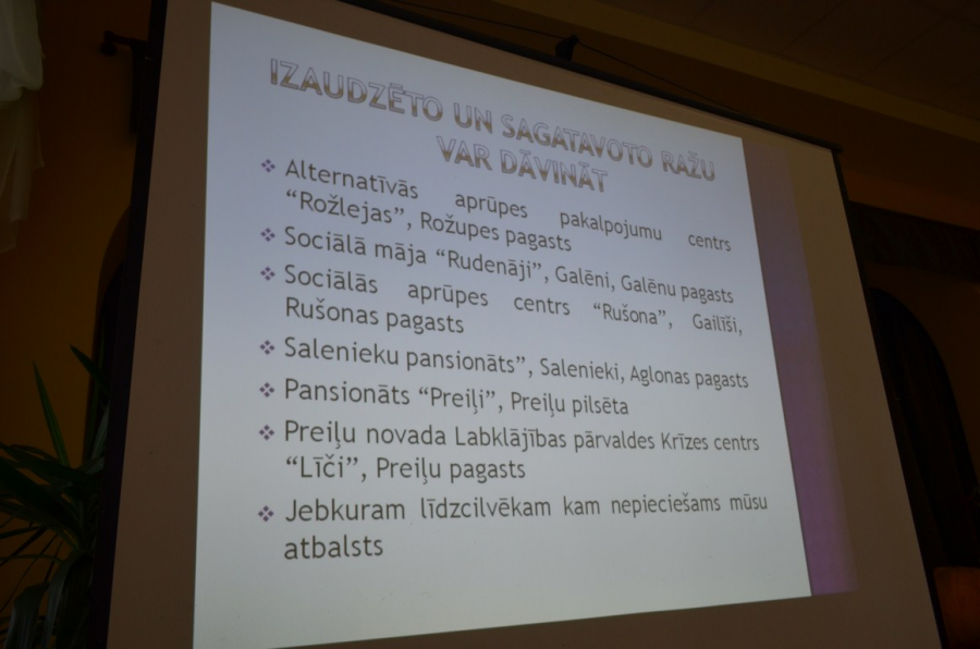 Uz pasākumu mēs, Viduslatgales pārnovadu fonda darbinieki, kopā pulcinājām projektā iesaistītās ģimenes no Preiļu, Līvānu, Riebiņu, Aglonas un Vārkavas novadiem un novadu sociālos darbiniekus, kas bija lieli palīgi projekta īstenošanas laikā. Projekta mērķis bija palīdzēt novados dzīvojošajām ģimenēm ar bērniem un maznodrošinātajām ģimenēm iegādāties sēklas un stādus, lai varētu paši sev uzaudzēt dārzeņus un sagatavot pārtikas krājumus ziemai, kā arī mācīt ģimenes dalīties ar uzaudzēto. Katrs novads bija izveidojis kompozīciju no dārza veltēm, tās papildinot ar košajām rudens lapām, kastaņiem, ozolzīlēm un vēl daudz ko citu. Projekta dalībnieki uz pasākumu bija saveduši ķirbjus, kabačus, burkānus, bietes, sīpolus, kāpostus un ievārījuma burciņas. Pasākumā piedalījās alternatīvās aprūpes pakalpojumu centra „ROŽLEJAS” pārstāvji. Viņi pateicās par sarūpētajiem labumiem, kuri tiks gatavoti un celti galdā aprūpes centrā. Labus vārdus projekta atbalstītājiem un īstenotājiem teica Vārkavas novada domes priekšsēdētāja Anita Brakovska. Rādījām arī prezentāciju, kur ģimeņu veikumu varēja redzēt bildēs. Ar saviem iespaidiem par projektu dalījās Kristīne Andrejeva no Līvānu novada un Pastaru ģimene no Preiļu novada. Pasākumā piedalījās Borisa un Ināras Teterevu fonda labdarības projekta „Pats savam saimes galdam” vadītāja Inga Skrastiņa.